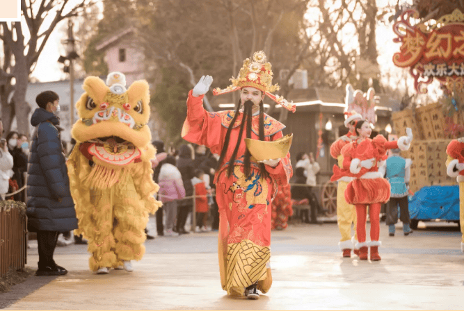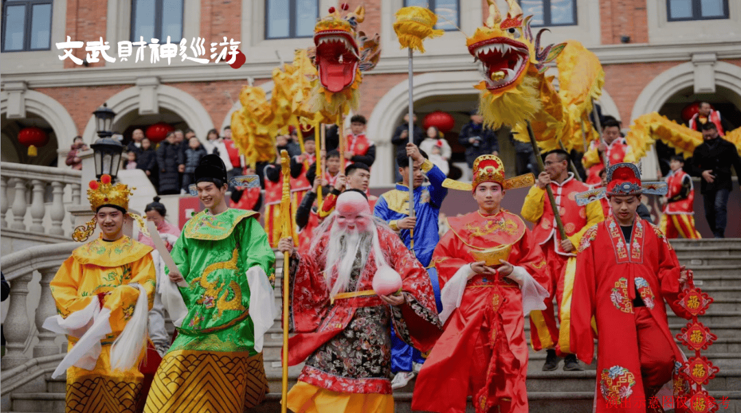 财神送福:伴随着舞龙舞狮、牛儿灯队伍,五路财神巡游,向路人发放“福”字帖,寓意招财进宝。