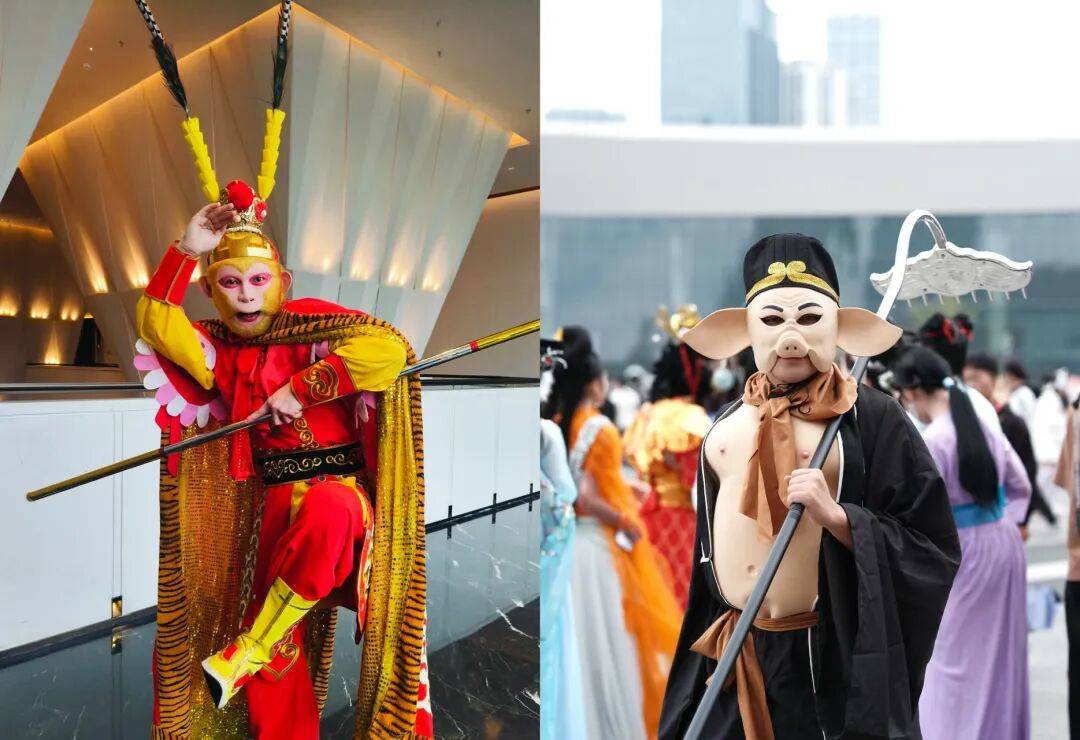 亲子互动:国漫NPC如哪吒、孙悟空巡游,与小朋友合影玩耍;玩偶熊猫,营造欢乐氛围,适合全家拍照打卡。