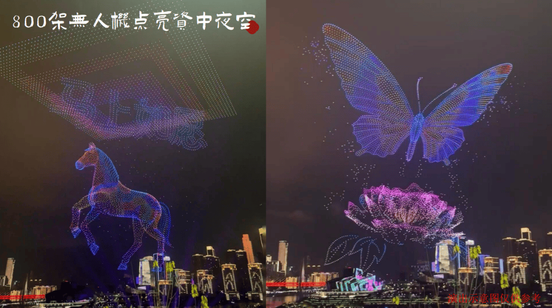 大年初一晚上8:00时开始,800架无人机编队表演点亮夜空,搭配非遗“打铁花”、火龙飞舞,更有凤凰、天马飞行器凌空翱翔,打造震撼视听盛宴!