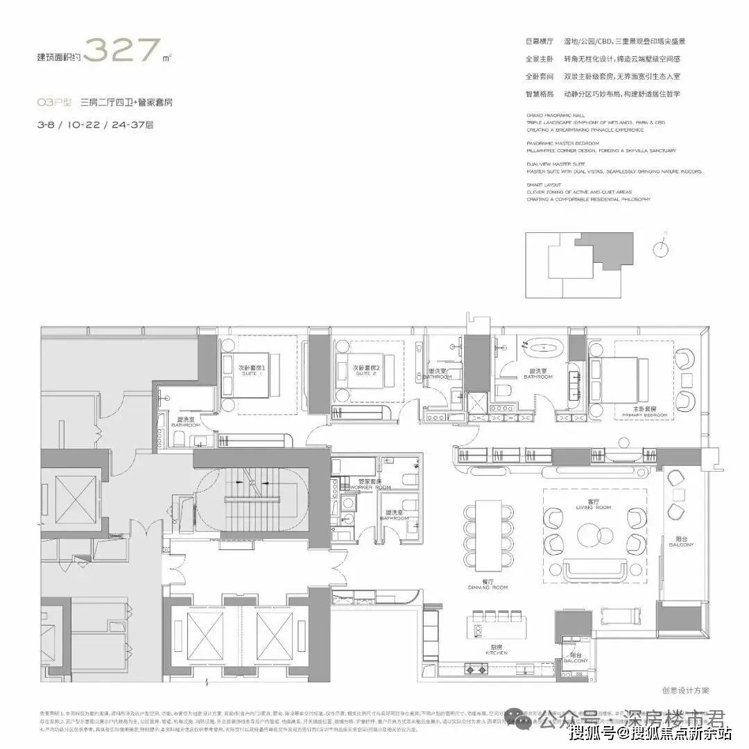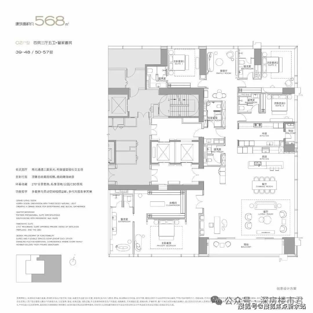 南北通透三面采光,顶奢总统套房规格,270°全景套房,享受湿地/公园/CBD景观,都是套房设计,更具私密性,中西厨分离。
