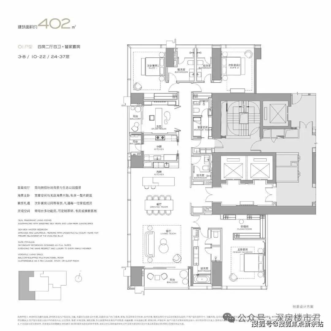 在深超总约1.17平方公里的土地上,项目以仅3.0的超低容积率,打造建面约300-1000㎡纯粹大平层藏品。约3.6米层高、大尺度阳台、无界景观视野,诠释了在高密度核心区实现“低密奢居”的可能,其规划理念极具借鉴意义。