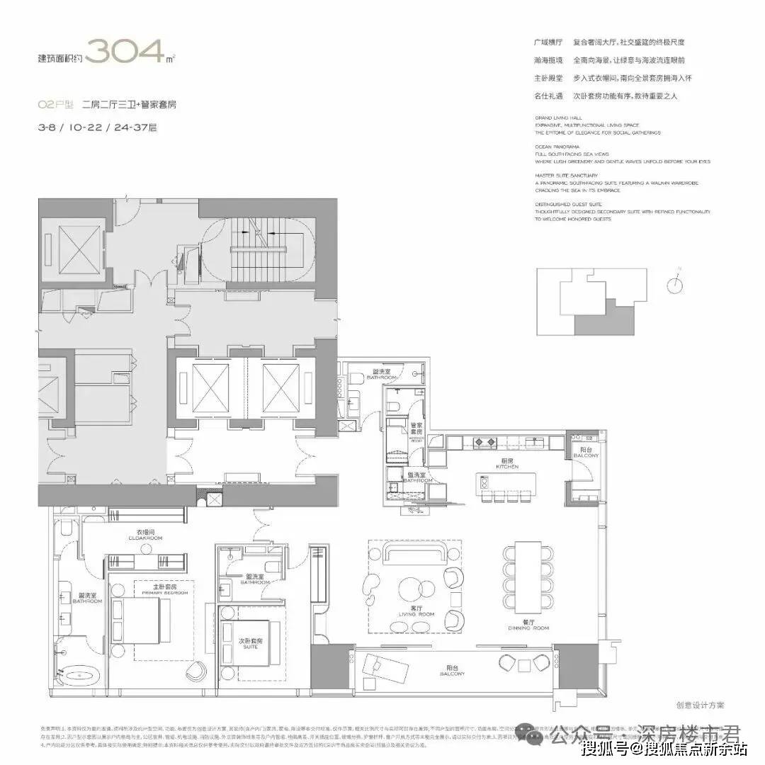 三百平做两房,在深圳应该是独一份的设计了,确实是非常奢享的定位!横厅客餐厅一体,尺度还是比较够,厨房旁边有独立生活阳台,两个套房设计,主卧步入式衣帽间。